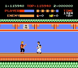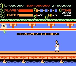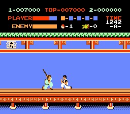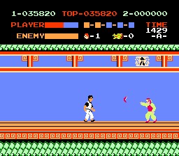 一开始左边右边就会出现一群的小喽啰,用站拳或蹲踢击退他们,打完后赶快往左边移动,因为这些家伙是无限的,打完了会不断地补货~ 用脚踢100分,用拳200分。其中会出现射飞镖的蓝衣角色,耐久力比较强些,需要打两下才打得掉,跳踢一下,蹲拳一下,这样分数是800分,比光用脚踢500分高。