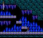 从心脏之馆出来后,向左方走,一直走到死亡之河前,装备上德拉克拉伯爵的心脏后,与船夫交谈他会把你带到一个隐藏的对岸,下船后向左走,会来到一个眼球之馆前,这时先不要进去,继续向左走,跳过一块块上下移动的石块后,来到最左方,如图14所示你会看见有个吉普赛人在那里,走过去和他交谈后他会送给你一件武器--跳矿石(跳矿石的威力取决于西蒙当时的Level,每用一次花1个红心),取得跳矿石后往回走进刚才的眼球之馆,一路先向上走后再向右下方走,在如图15所示的地方你会遇到Boss--死神(他的血很多,要耐心点打),打败他后会有一把金刀(每用一次花2个红心,威力最强的道具),然后向右走会来到放圆球的房间中,用木桩把圆球打碎后会得到德拉克拉伯爵的眼球,然后可以出眼球之馆了,在出眼球之馆前记得去找商人买一个木桩。出眼球之馆后向右走回到船夫那里,和他对话后坐船离开这个隐藏地点。 回到死亡之河的对岸后,按START键把装备改成红水晶球,然后和船夫交谈他会把你送到对岸去的(不是隐藏的对岸),下船后往左走会来到城市4中,向左走出城,不久你会来到如图16所示的一处岔路前,这时先走下楼梯,楼梯下是个毒沼,走过毒沼后继续向左,不久后会来到如图17所示的墓地中,这个墓地与城市3右方的墓地一样也是地上有两只手,在墓地中使用大蒜后会出现一个吉普赛人,与他对话后他会送给你一个丝袋(丝袋的作用是延长月桂树果的无敌时间)。然后原路回到图16所示的一处岔路前,这时就可以走岔路上边的路了,一路向左,不久会来到一个城市(城市5),在这座城中有一间空房的秘道内有个商人在卖钢鞭子,向他买后出城向左走,一直走如图18所示的地方会有一座大山挡住,这时按START键把红水晶球装备上,然后像图中的西蒙一样跪在大山前的石块上(按住方向下键不放),一会儿后会有一阵旋风飞过来把你带过大山。