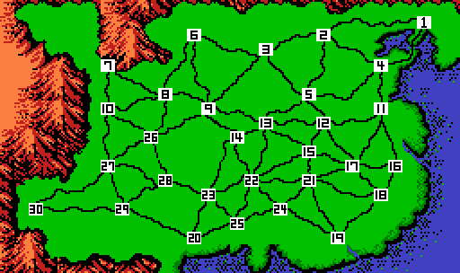1.按键设定: A:确定 B:取消 地图模式下,SELECT可以切换成道路图,B键可以查看城市情报。 2.详细介绍: 城市简介: 统治度:城市的民心归向。得民心者得天下。最高为100统治度低于50时,季节交换时会随机发生民众暴乱,会使土地,产业,人口,兵士锐减。 金(キン):孔方兄是也。没钱就什么都干不了! 米(コメ):粮草。战争必备! 土地:农业发展程度。十月收米就看它的了。最高999。 产业:商业发展程度。四月收金。最高999。 宝(タカラ):宝物。可提高武将度。 人口:城市人口数。人多金多,人多米多。最高99900。 防灾:预防灾害。夏季水灾,秋季旱灾。数高损失少,100时城市不受任何损害。 武将:官员数目。得人才者得天下。最高不超过10。 武将简介: -レベル-:等级。等级高时武将骑兵,弓兵比率高。策略,策略成功率也高。最高8级(EXP对应0,20,40,70,100,150,200,300) 兵种:山军,水军,平军。各军在不同的地形中机动力不同。 体:体力。 知:智力。高者作战策略,战术,成功率就高。可通过学习提高。 武:武力。90以下的武将可随等级的提高而增长。 德:魅力。德高者任太守时统治度提高快。且寻找武将时成功率高。 忠:忠诚度。低于75时易被策反。 经:经验值。决定等级,武力,计略,计略成功率。 武器:分为剑,枪,刀。单挑时起作用。可从与君主单挑时获得特殊武器。 防具:同武器。 3.指令篇