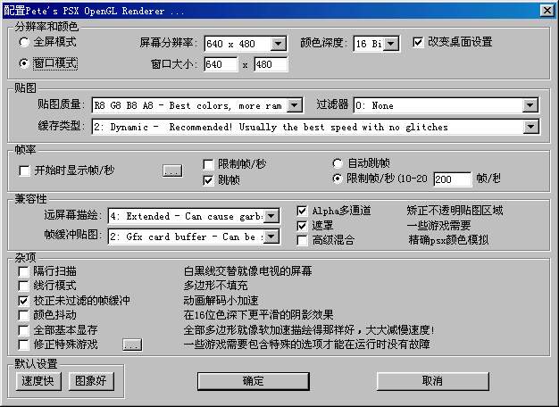 Pete OpenGL Driver插件对3D游戏速度比较快,用于实况足球,山脊赛车4等能得到较好的速度。它的设置请见图2,如果你想全屏幕运行PS的游戏,请在分辨率和颜色中把全屏模式选中即可。