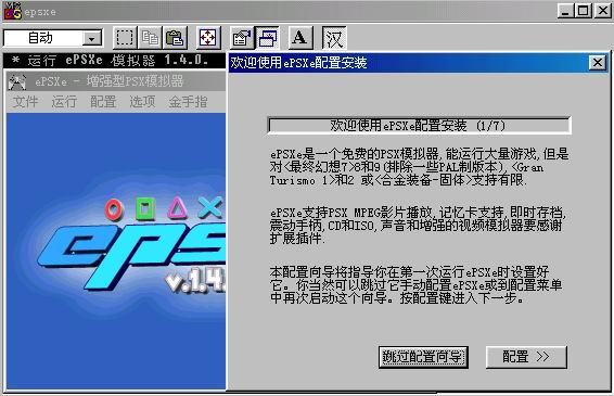 PS模拟器ePSXe使用详解 ePSXe是一个PlayStation游戏机的模拟器,可以玩Sony PlayStation的游戏,包括经典的<最终幻想7、8、9><恶魔城-月下夜想曲><勇者斗恶龙7>等等,现在就先为大家介绍ePSXe. 准备 解开你在本站下载的ePSXe的压缩包后,运行epsxe.exe出现模拟器主画面(如图1),这个模拟器由一个DOS窗口和一个window窗口组成,如果你第一次运行这个模拟器,它会弹出欢迎使用ePSX配置安装的对话框。